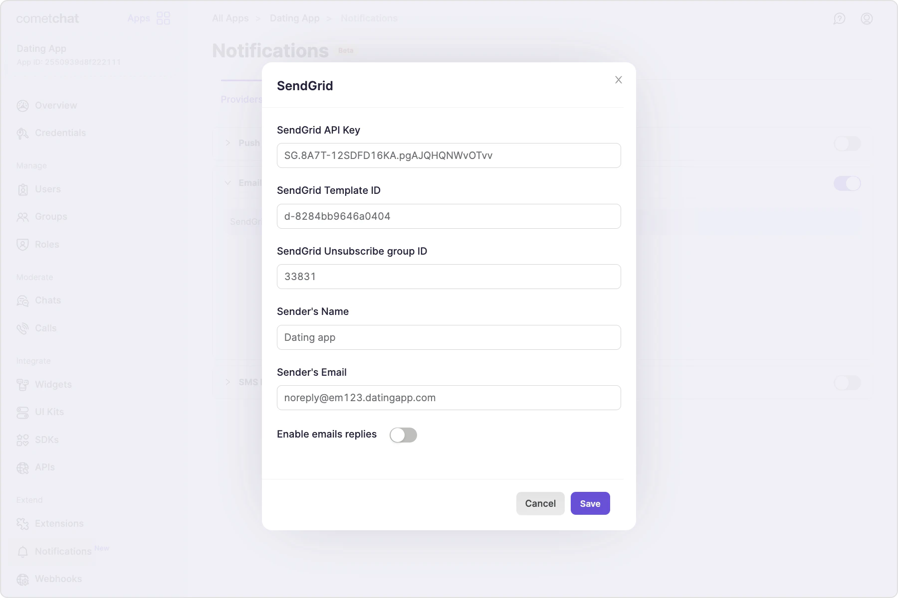 Connect CometChat email notifications to SendGrid or your own provider, wire the required webhooks, and keep timezones in sync for scheduling.