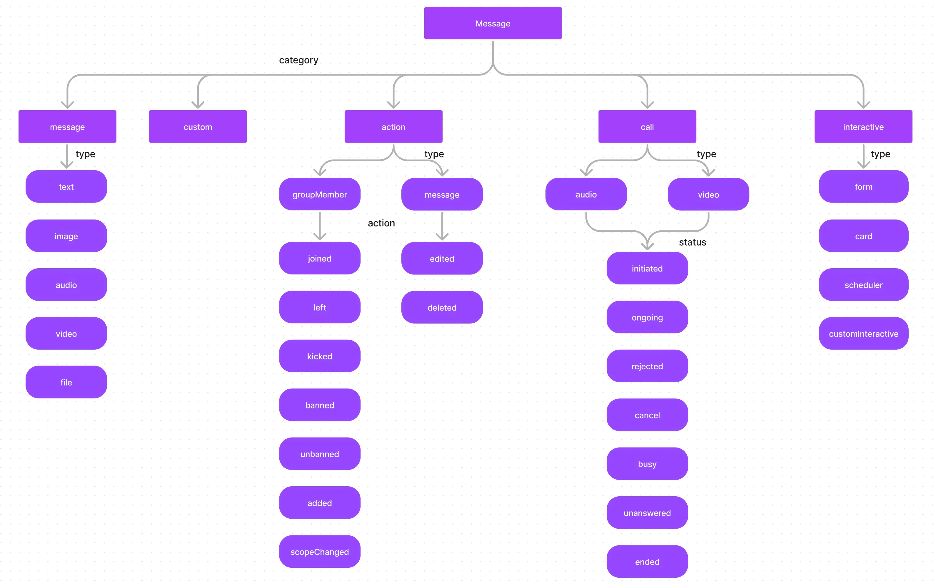 Messages with the category call are Calling related messages. These can belong to either one of the 2 types- audio
