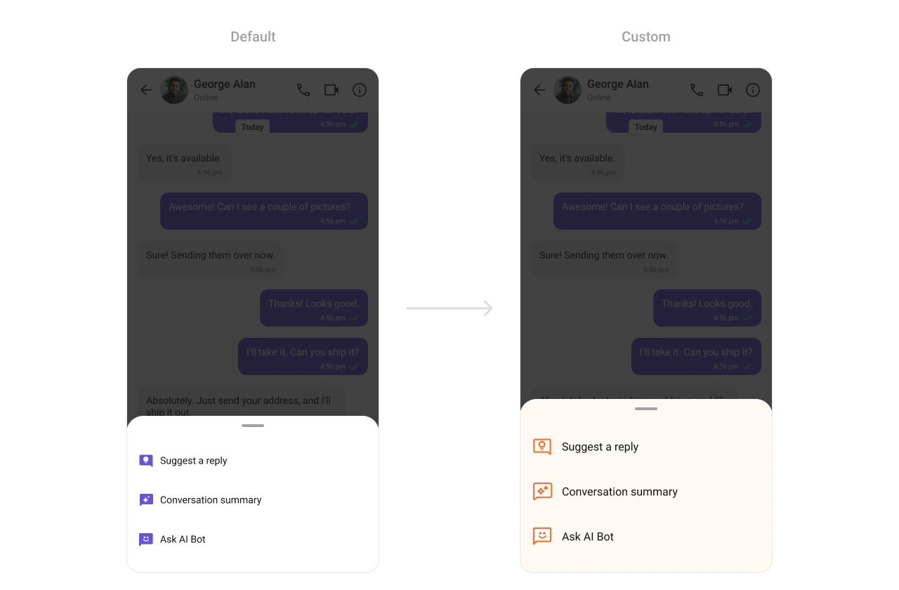 TheCometChatAIOptionSheet Component offers AI-powered action options, like generating replies or initiating voice-to-text commands. It allows developers to style icons, colors, and interaction elements for a polished and user-friendly interface.