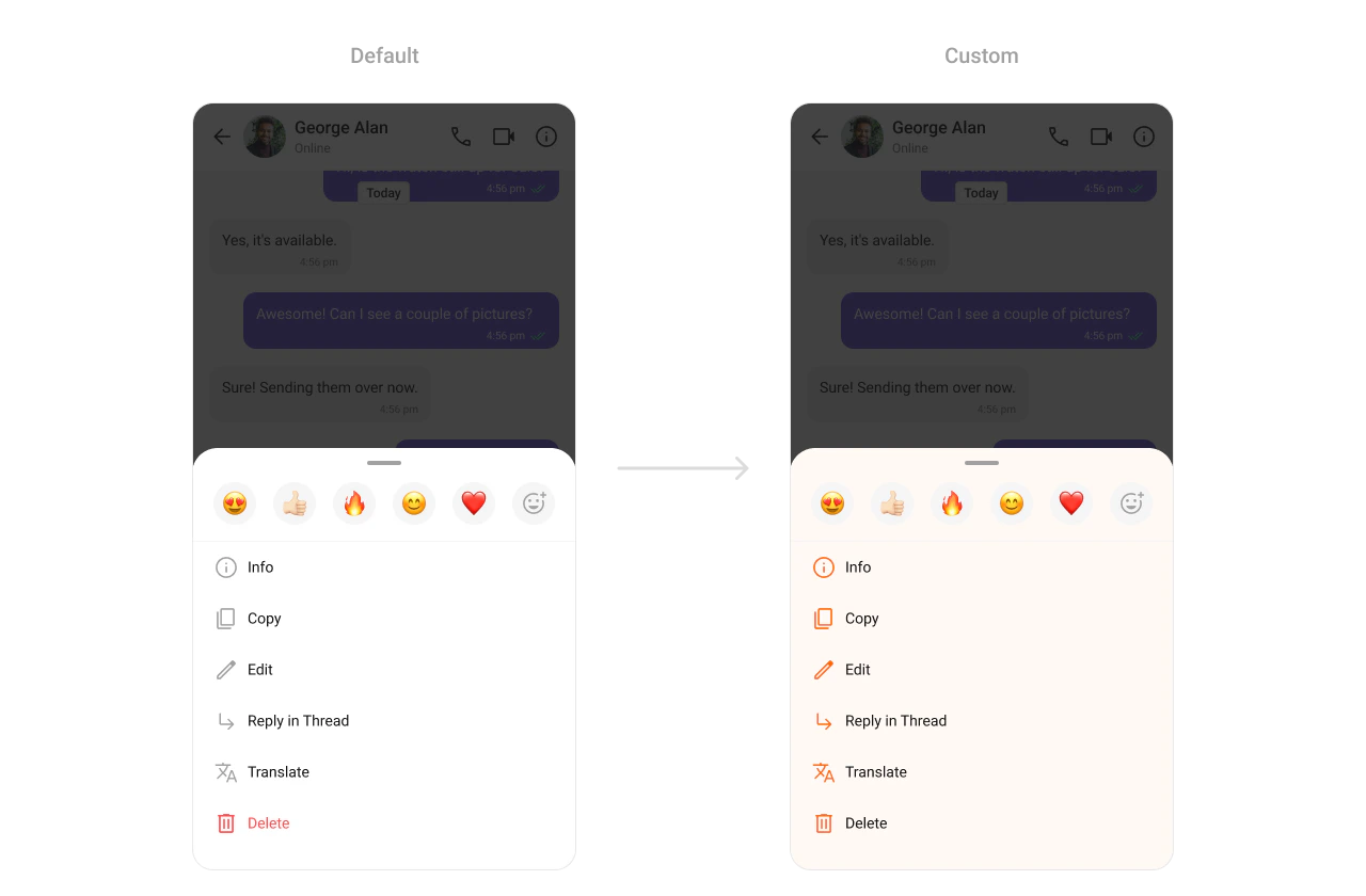TheCometChatMessageOptionSheet Component is a context menu for performing actions on messages, such as replying, forwarding, or deleting. Developers can style its background, icons, and text to match the app’s menu system.