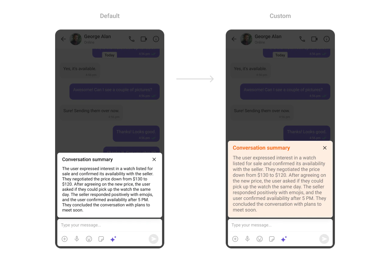 TheCometChatConversationSummary Component highlights the essence of a conversation, including participant details, last message, and timestamp. Customize text sizes, colors, and spacing to create visually distinct summaries that improve readability and engagement.