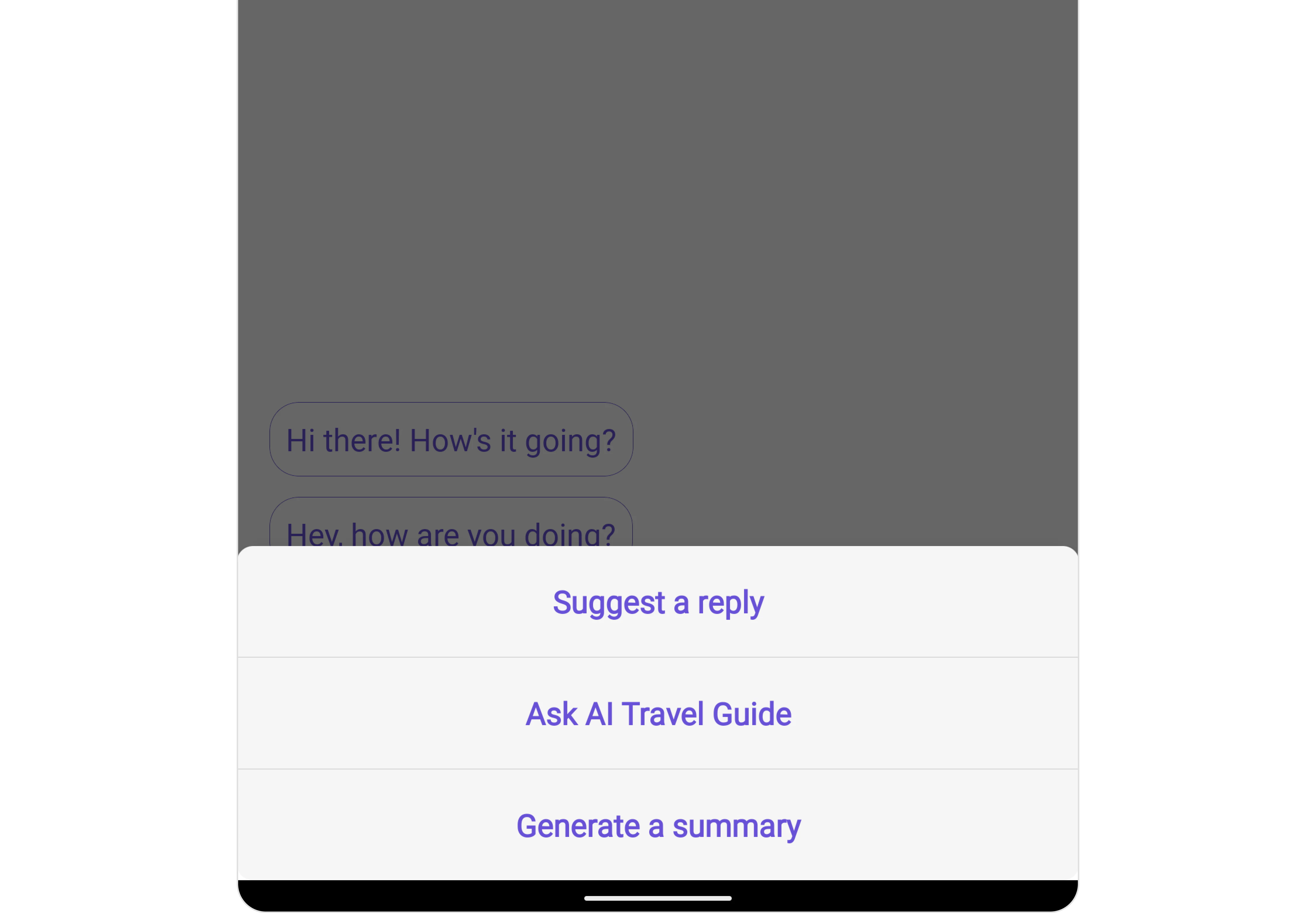 Smart Replies are AI-generated responses to messages. They can predict what a user might want to say next by analyzing the context of the conversation. This allows for quicker and more convenient responses, especially on mobile devices. For a comprehensive understanding and guide on implementing and using the Smart Replies, refer to our specific guide on the Smart Replies. Once you have successfully activated the Smart Replies from your CometChat Dashboard, the feature will automatically be incorporated into the Action sheet of MessageComposer Component of UI Kits.