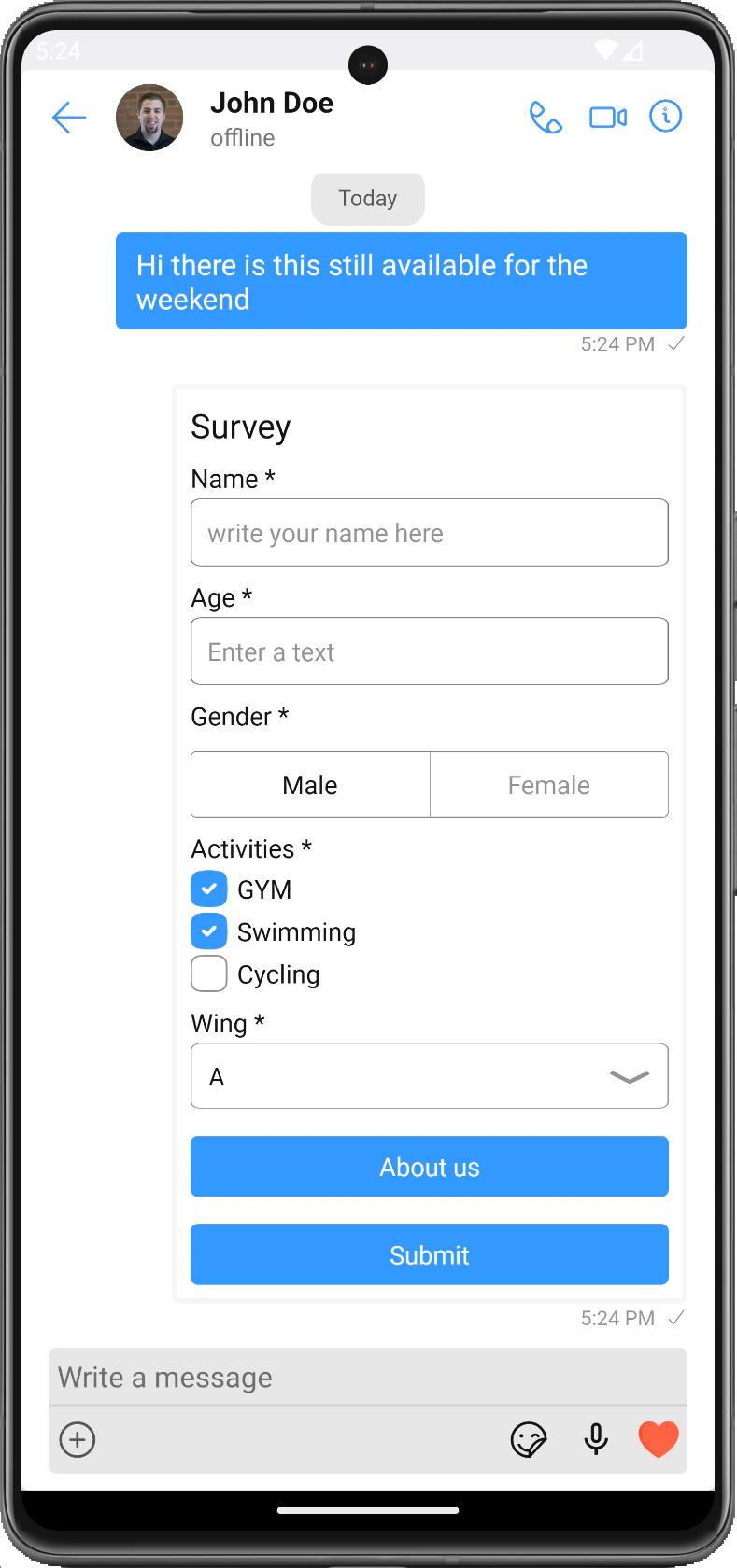 setFormMessageFormMessageAn instance of the FormMessage class which holds information about the form fields. The form inputs are dynamically built based on the form fields’ information in the message.