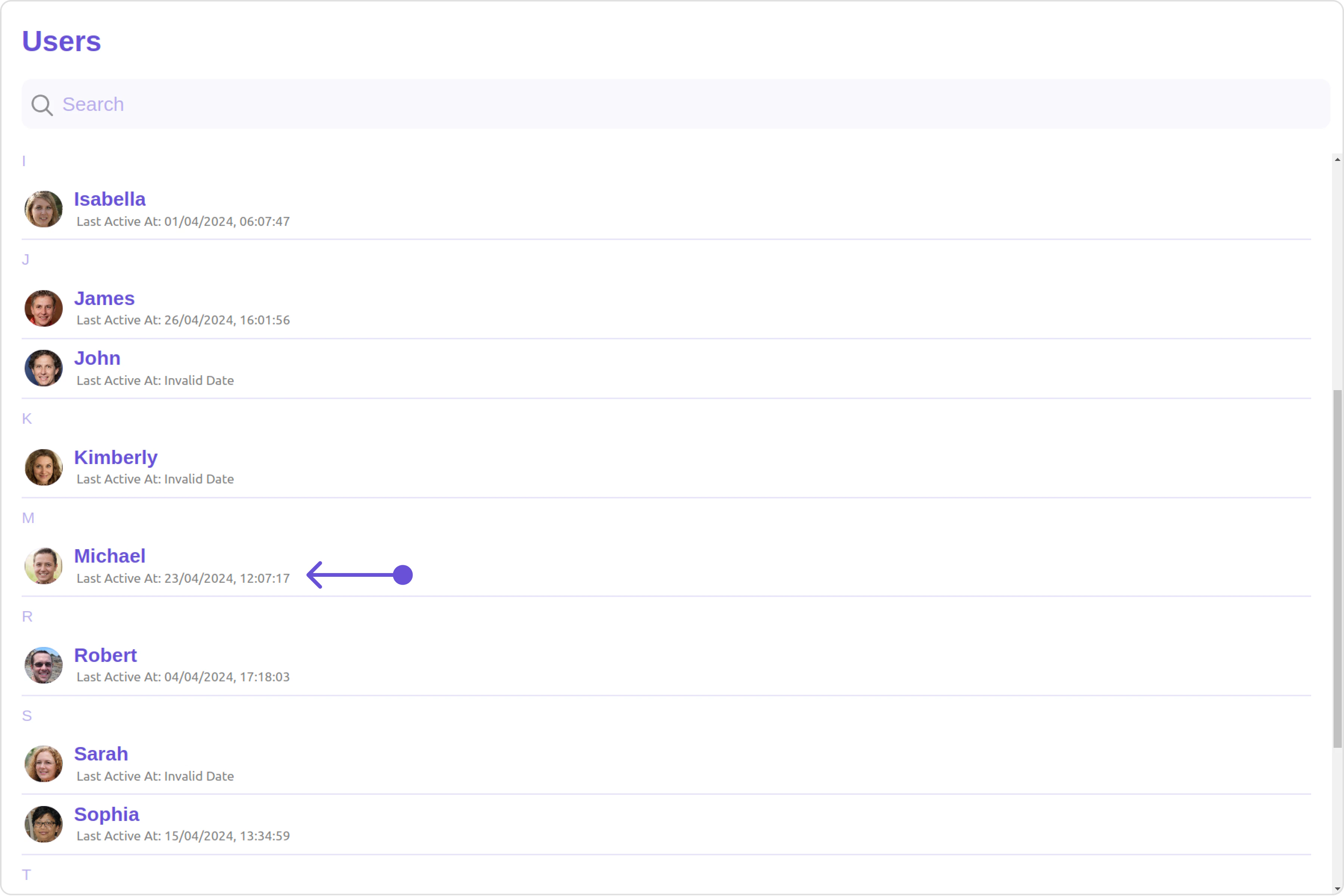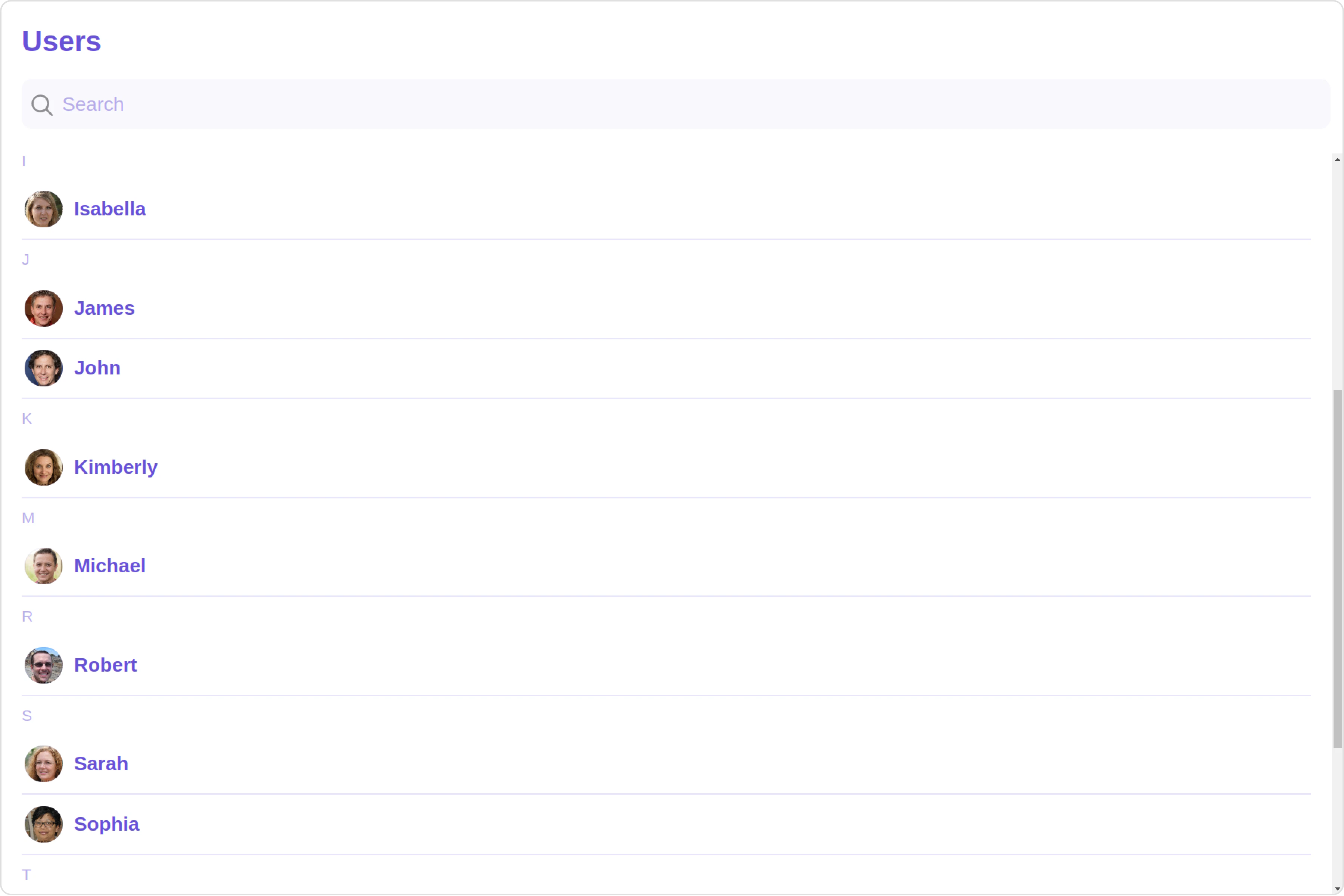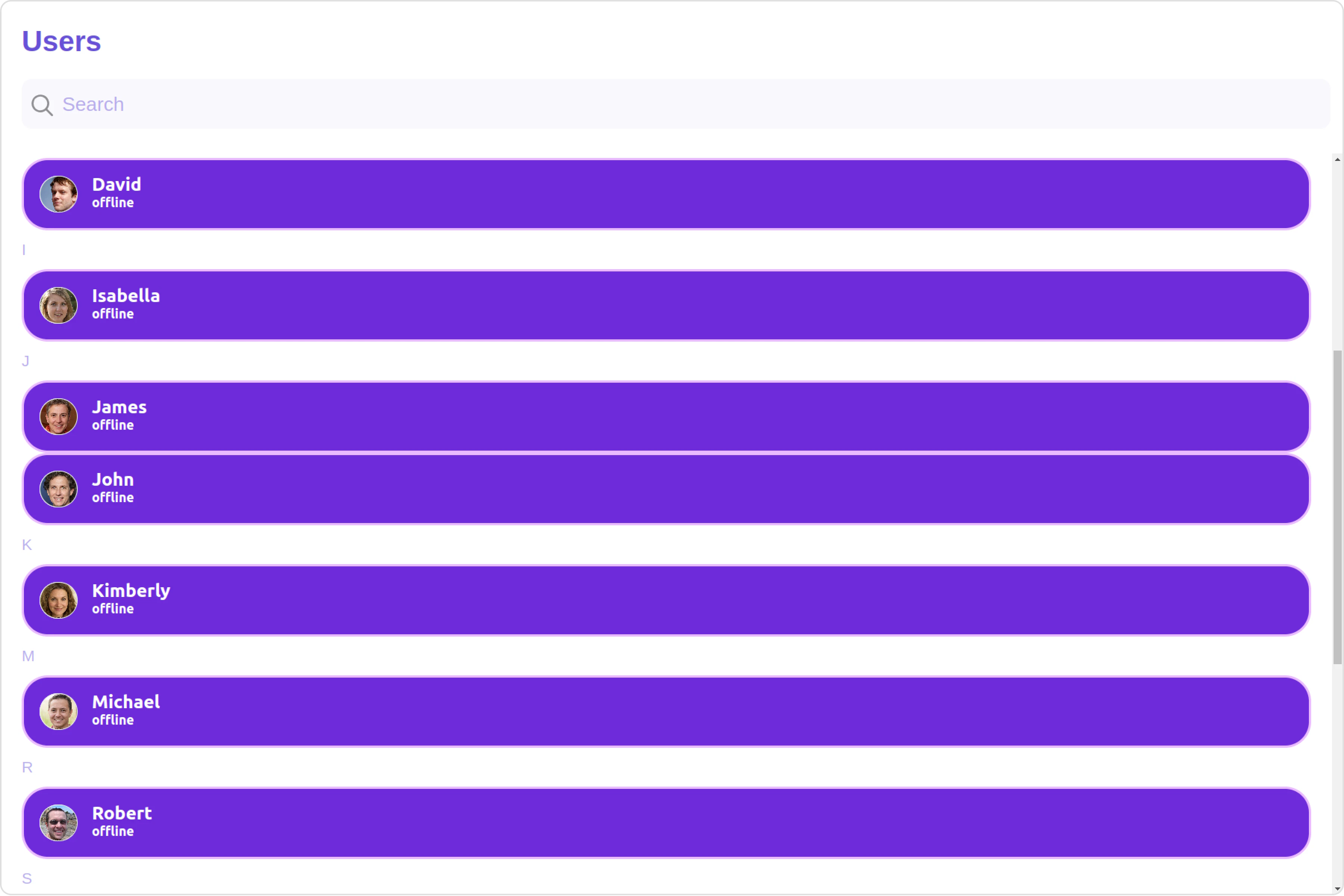 The Users is a Component, showcasing an accessible list of all available users. It provides an integral search functionality, allowing you to locate any specific user swiftly and easily. For each user listed, the widget displays the user’s name by default, in conjunction with their avatar when available. Furthermore, it includes a status indicator, visually informing you whether a user is currently online or offline.