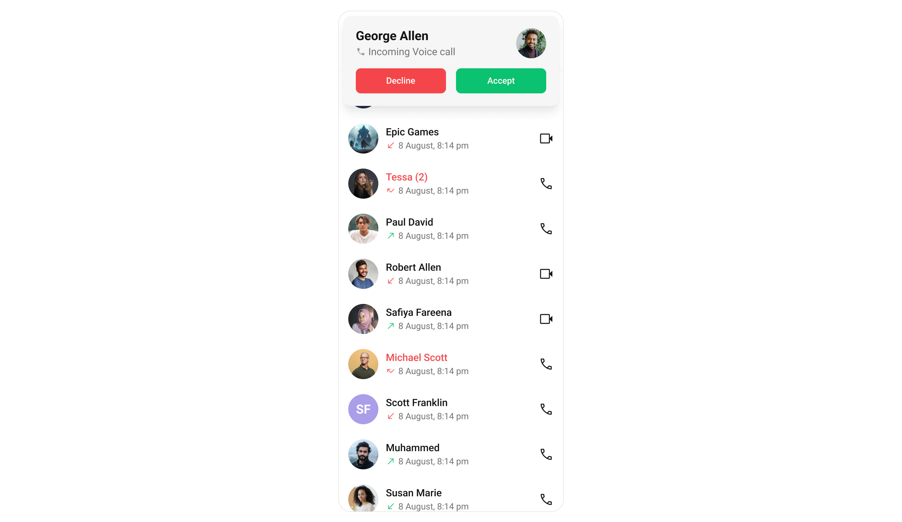 The Incoming Call widget of the CometChat UI Kit provides the functionality that lets users receive real-time audio and video calls in the app. When a call is made to a user, the Incoming Call widget triggers and displays a call screen. This call screen typically displays the caller information and provides the user with options to either accept or reject the incoming call.