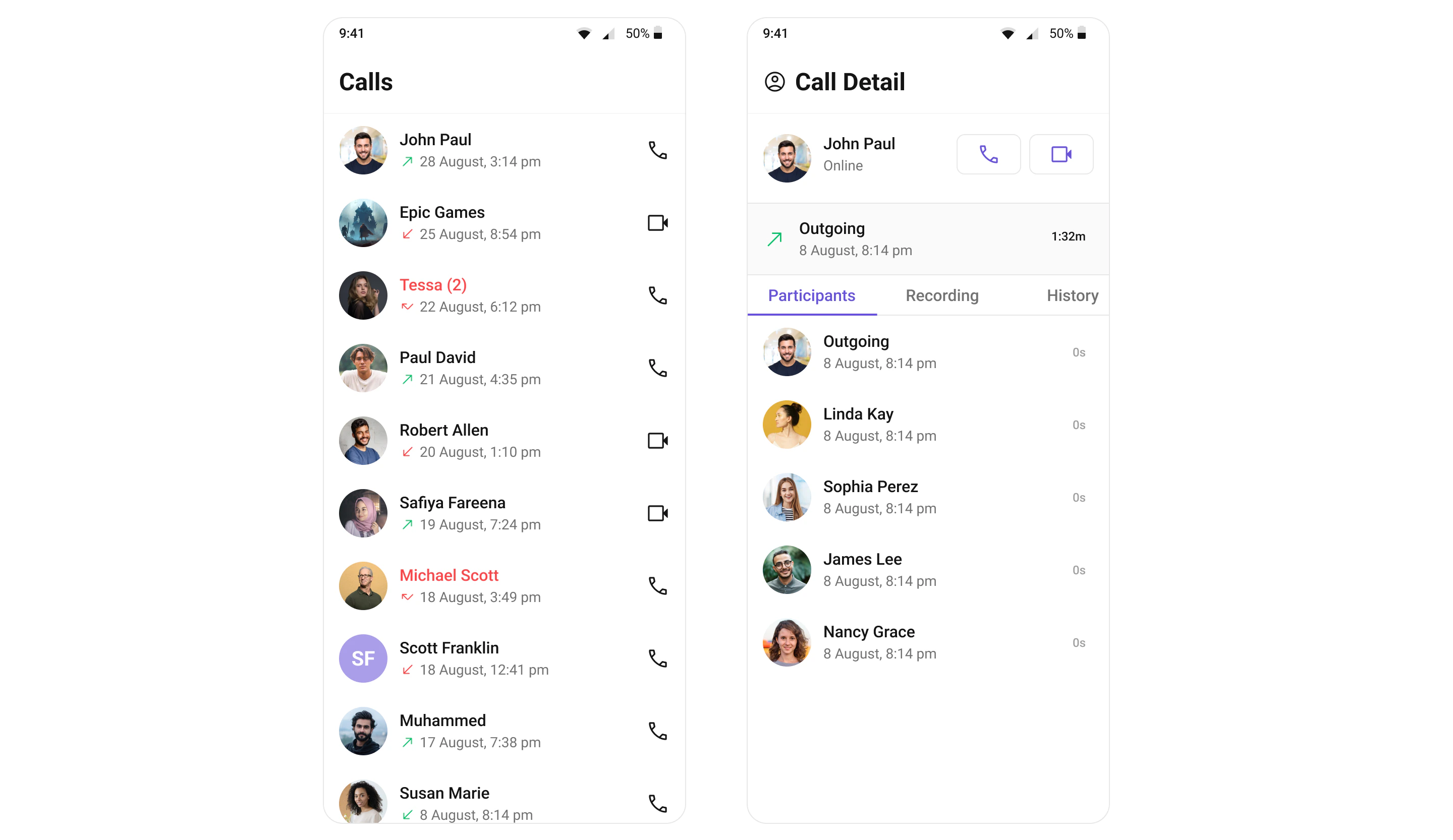 Call Logs widget provides you with the records call events such as who called who, the time of the call, and the duration of the call. This information can be fetched from the CometChat server and displayed in a structured format for users to view their past call activities.