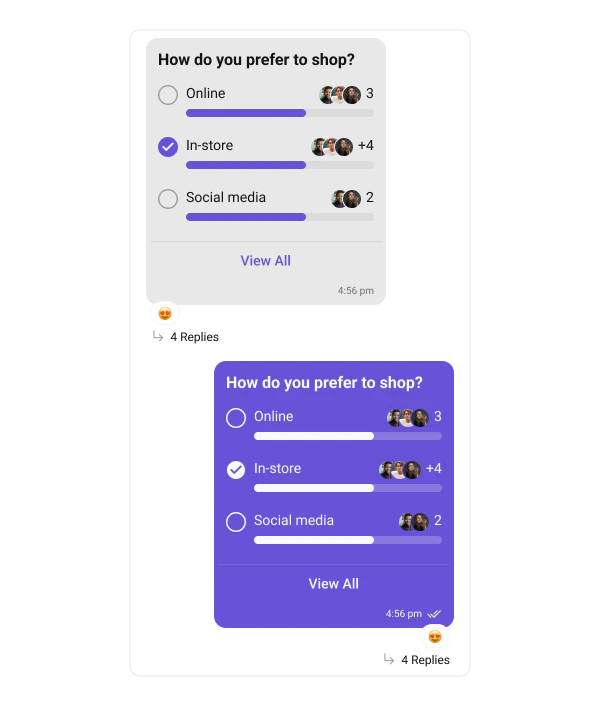 Poll bubbles display messages with polling. The following code snippet shows how customize the Poll message bubble: