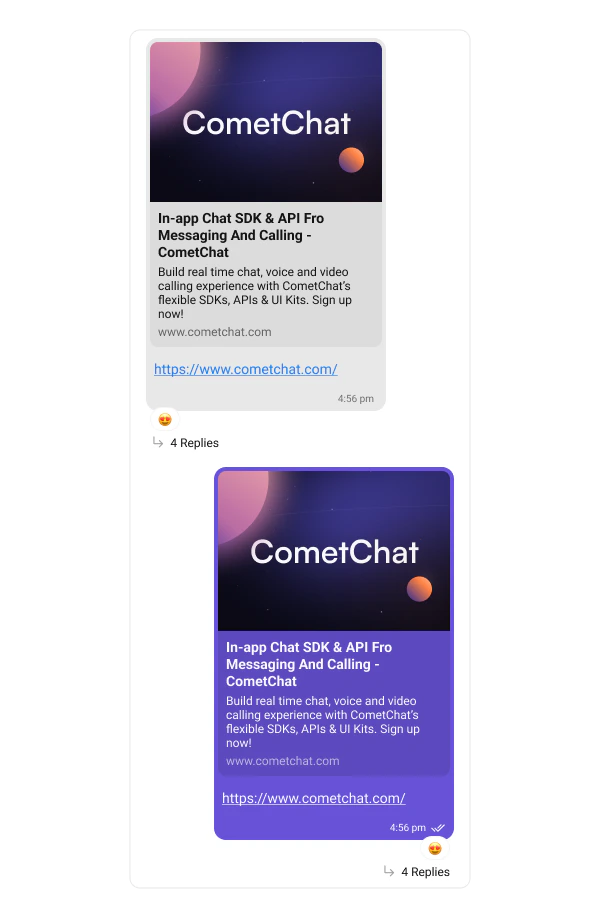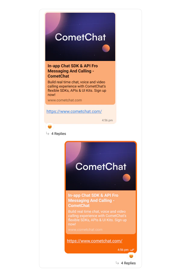 The Link Preview Bubble is designed to display a preview of links shared in messages. It enriches the messaging experience by showing details such as the page title, description, and an image from the linked content, making links more engaging and informative. The following code snippet shows how customize the Link preview message bubble: