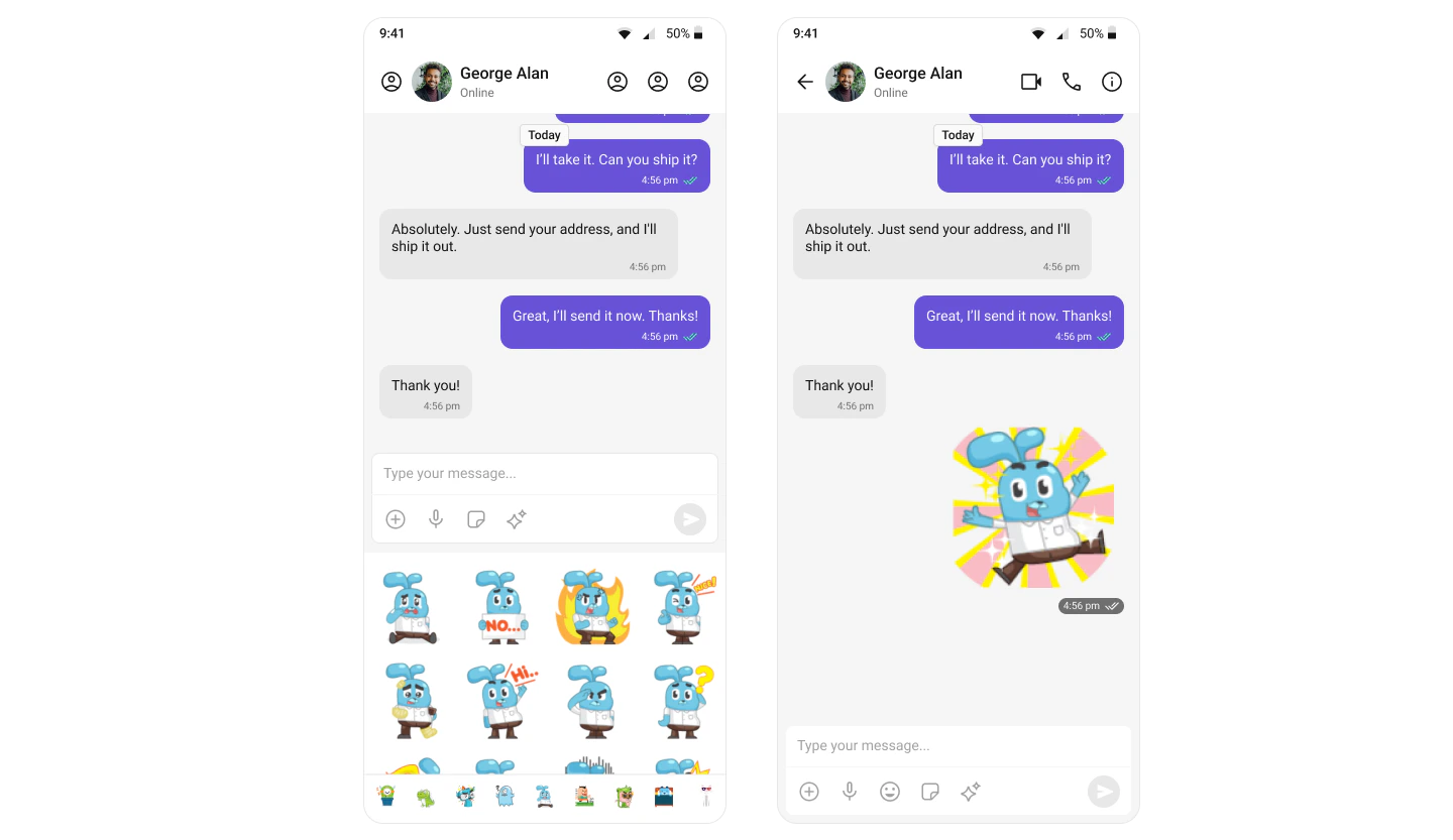 The Stickers extension allows users to express their emotions more creatively. It adds a much-needed fun element to the chat by allowing users to send various pre-designed stickers. For a comprehensive understanding and guide on implementing and using the Sticker Extension, refer to our specific guide on the Sticker Extension. Once you have successfully activated the Sticker Extension from your CometChat Dashboard, the feature will automatically be incorporated into the Message Composer component of UI Kits.