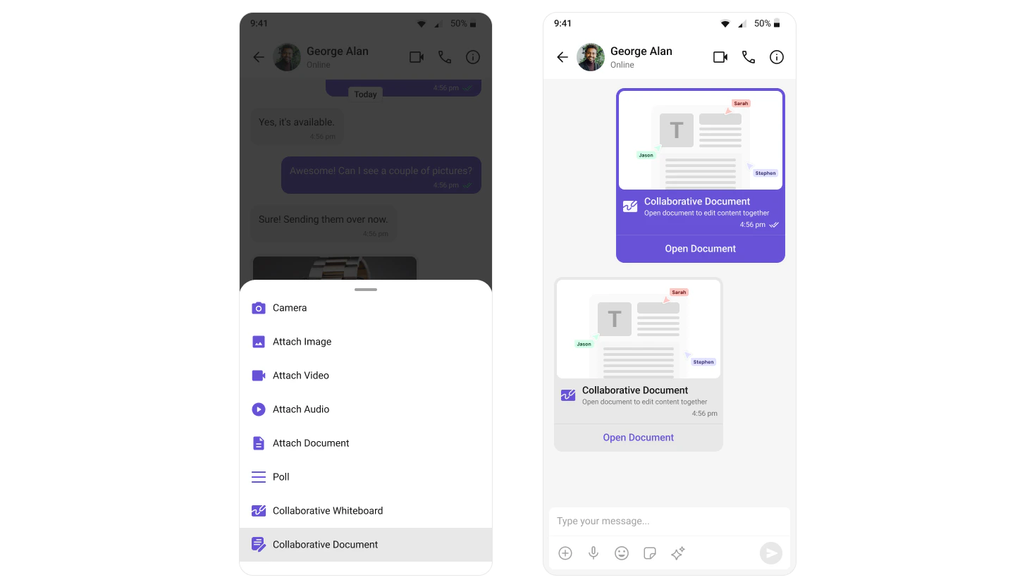 With the Collaborative Document extension, users can work together on a shared document. This feature is essential for remote teams where document collaboration is a recurring requirement. For a comprehensive understanding and guide on implementing and using the Collaborative Document Extension, refer to our specific guide on the Collaborative Document Extension. Once you have successfully activated the Collaborative Document Extension from your CometChat Dashboard, the feature will automatically be incorporated into the Action Sheet of the Message Composer component of UI Kits.