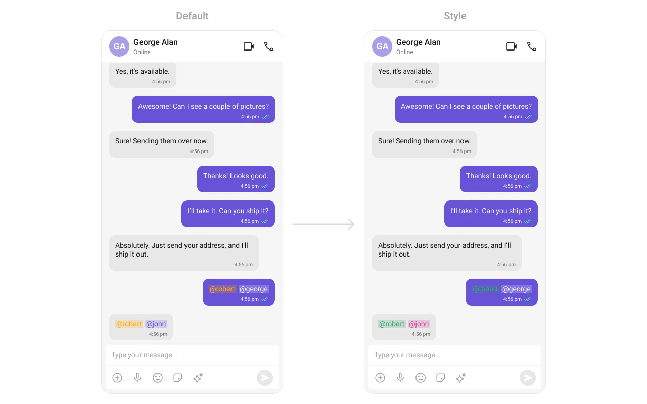 To fit your app’s design requirements, you can customize the appearance of the conversation component. We provide exposed methods that allow you to modify the experience and behavior according to your specific needs.Style