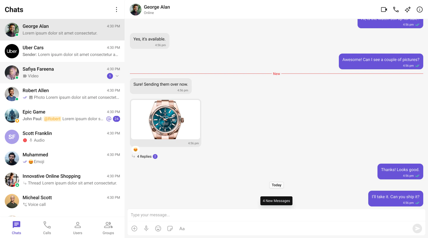 | Conversations | Conversations is a component that renders conversation list item. Conversation item also displays the delivery status of the last message providing users with real-time updates on the status of their messages. |