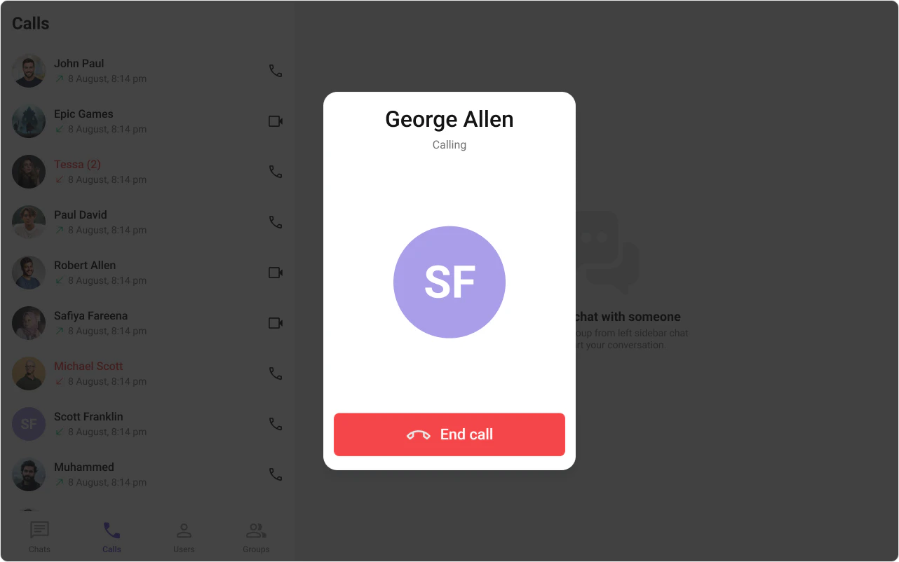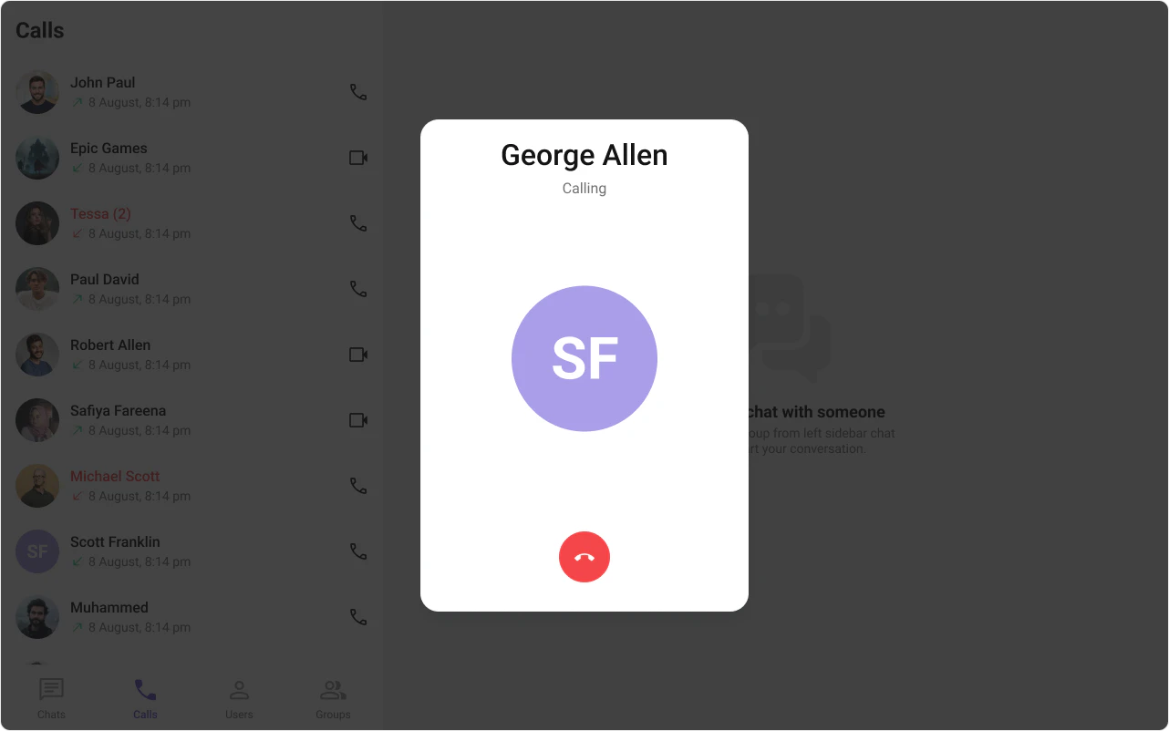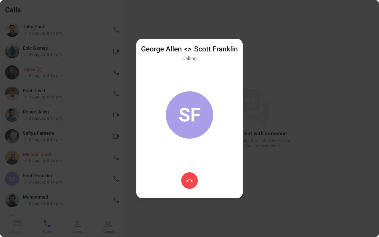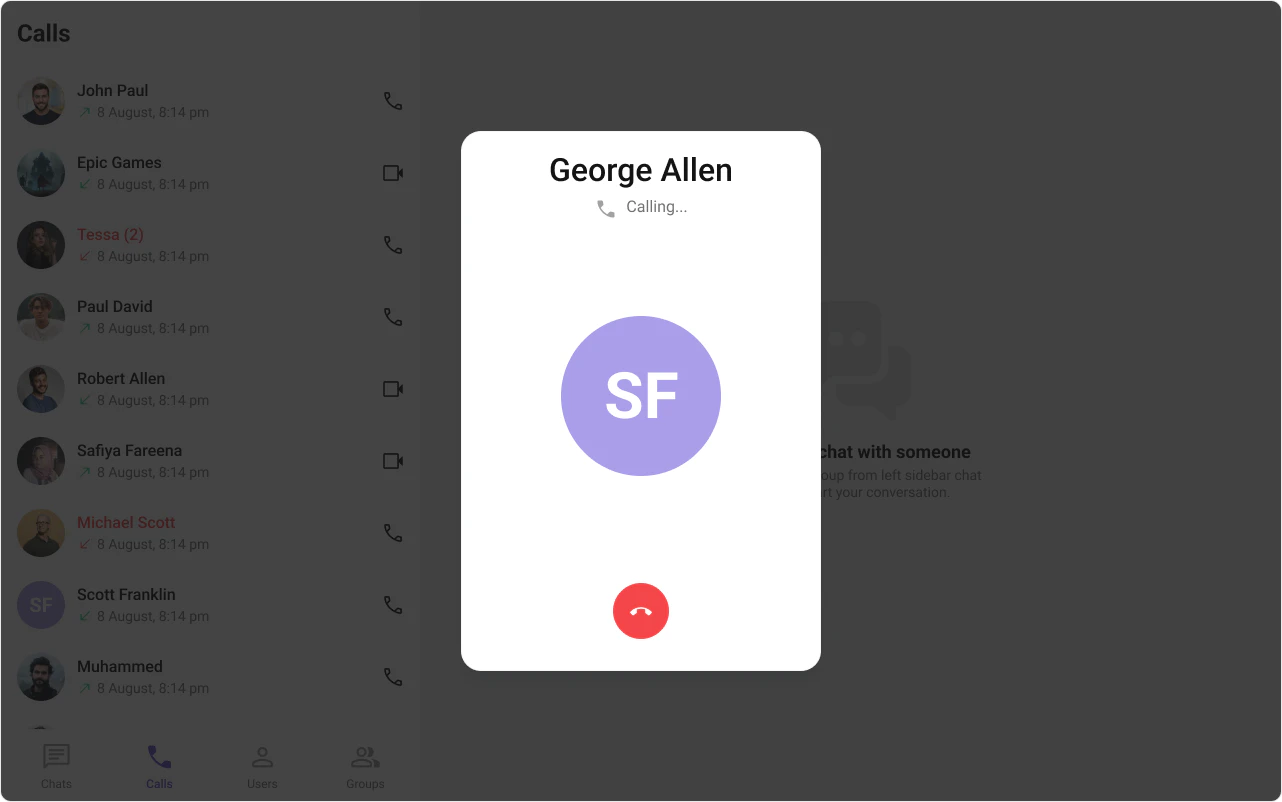 This prop renders the custom cancel-call button view for the outgoing call. Use this to override the existing cancel call button view from the outgoing call. The customized chat interface is displayed below.