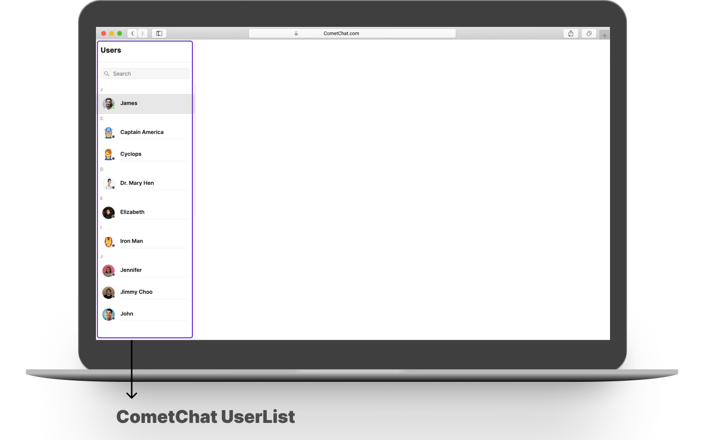 TheCometChatUserList is a component that displays the list of users available to chat. You can use this component within your app if you wish to display the list of users.