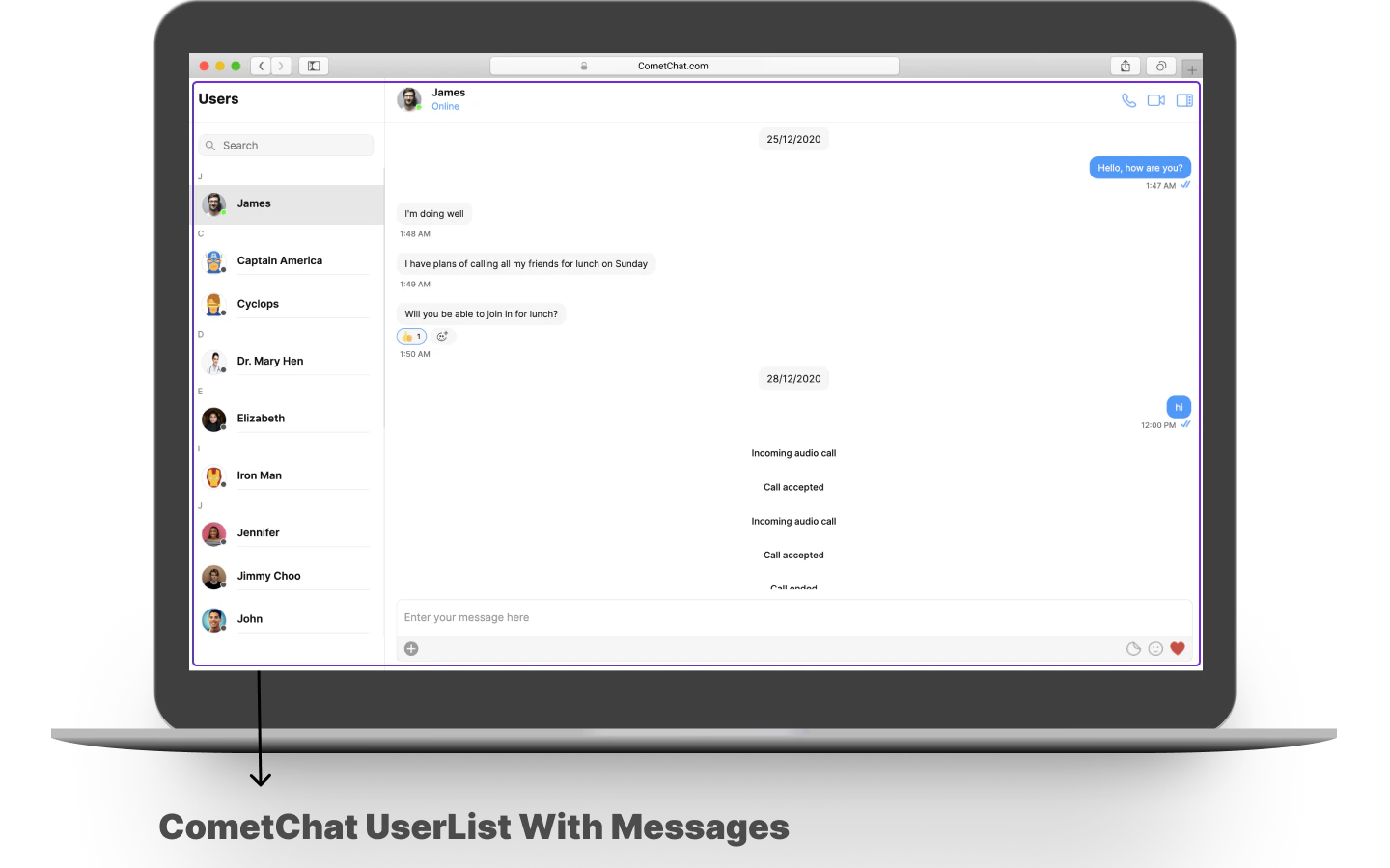 TheCometChatUserListWithMessages is a component with a list of users. The component has all the necessary listeners and methods required to display the user’s list and shows the set of the messages/chats of the selected user.