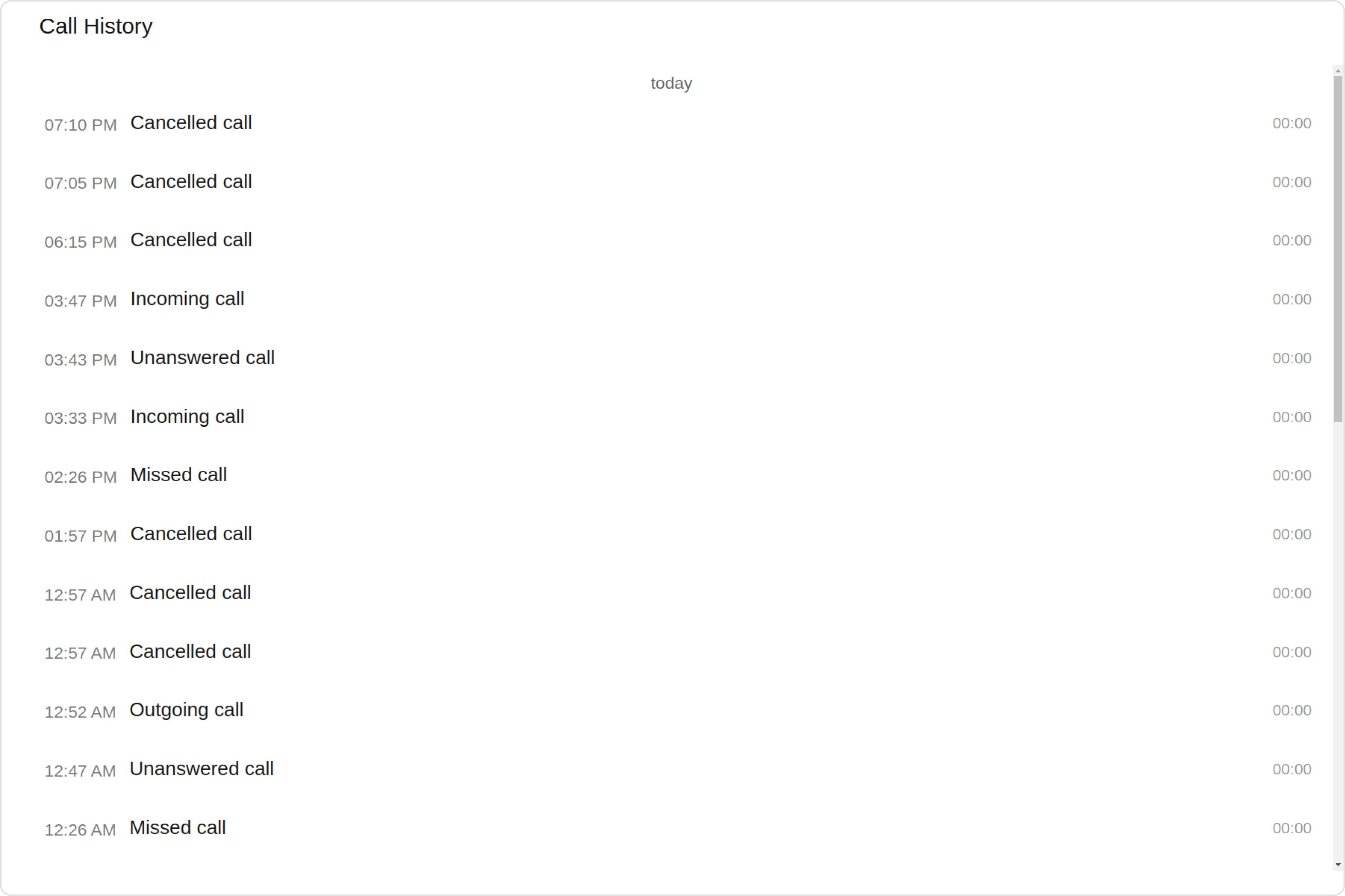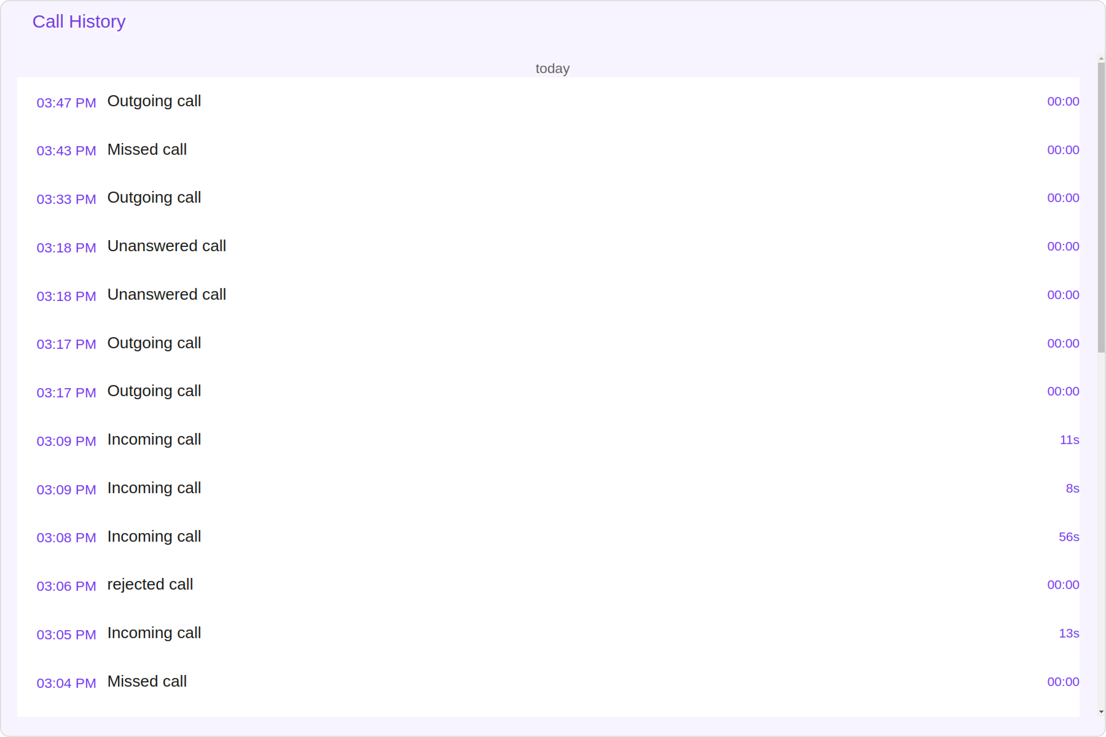 To customize the appearance, you can assign aCallLogHistoryStyle object to the Call Log History component.