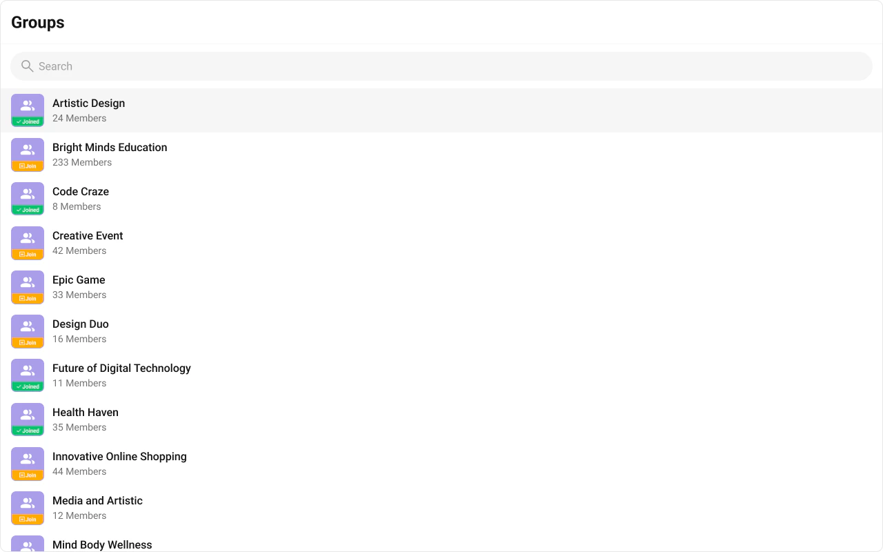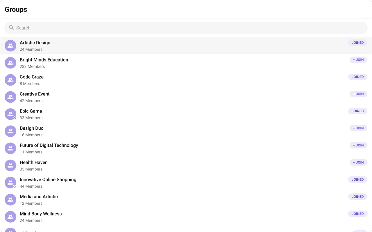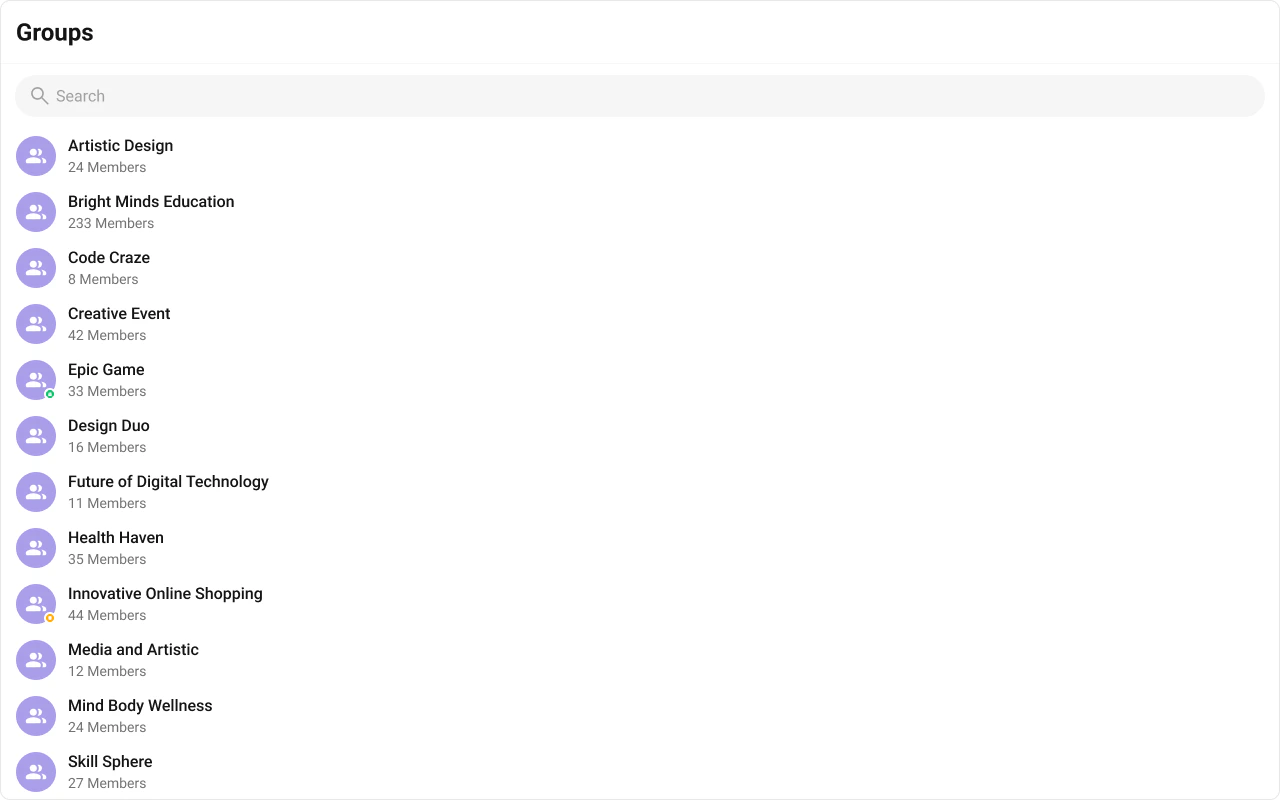 The Groups is a Component, showcasing an accessible list of all available groups. It provides an integral search functionality, allowing you to locate any specific groups swiftly and easily. For each group listed, the group name is displayed by default, in conjunction with the group icon when available. Additionally, it provides a useful feature by displaying the number of members in each group as a subtitle, offering valuable context about group size and activity level.