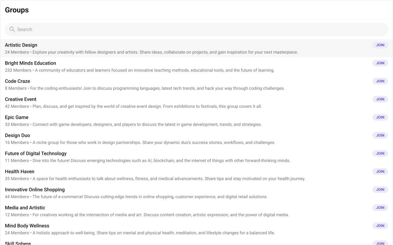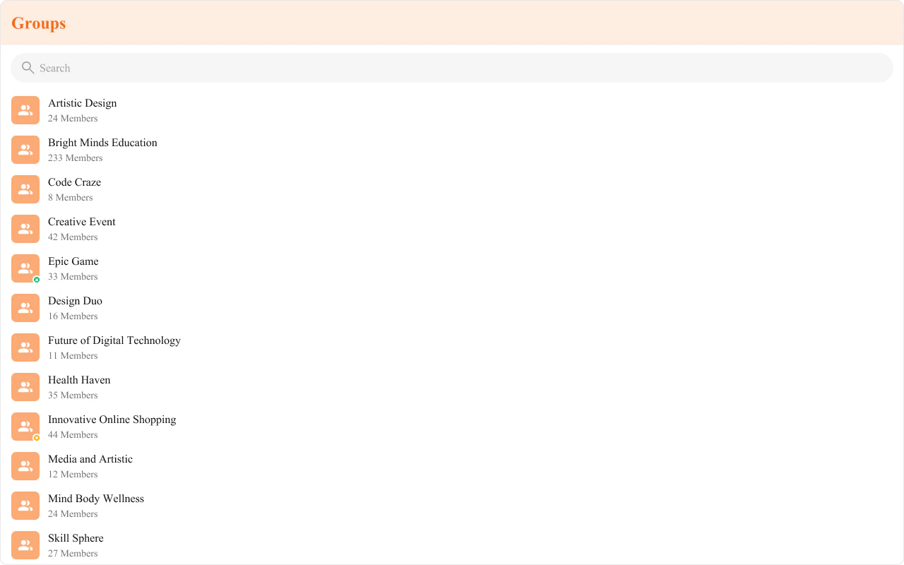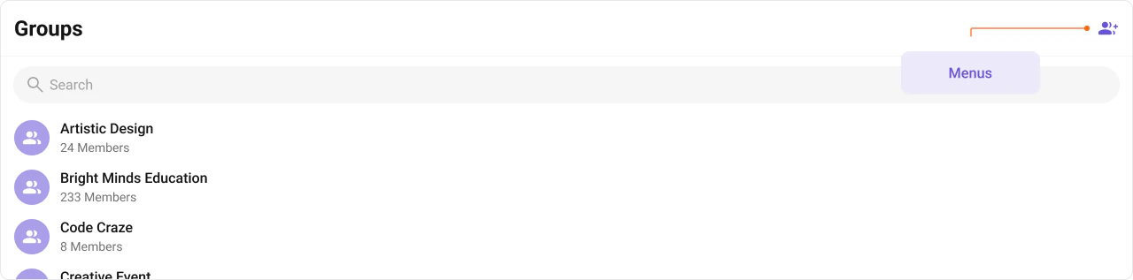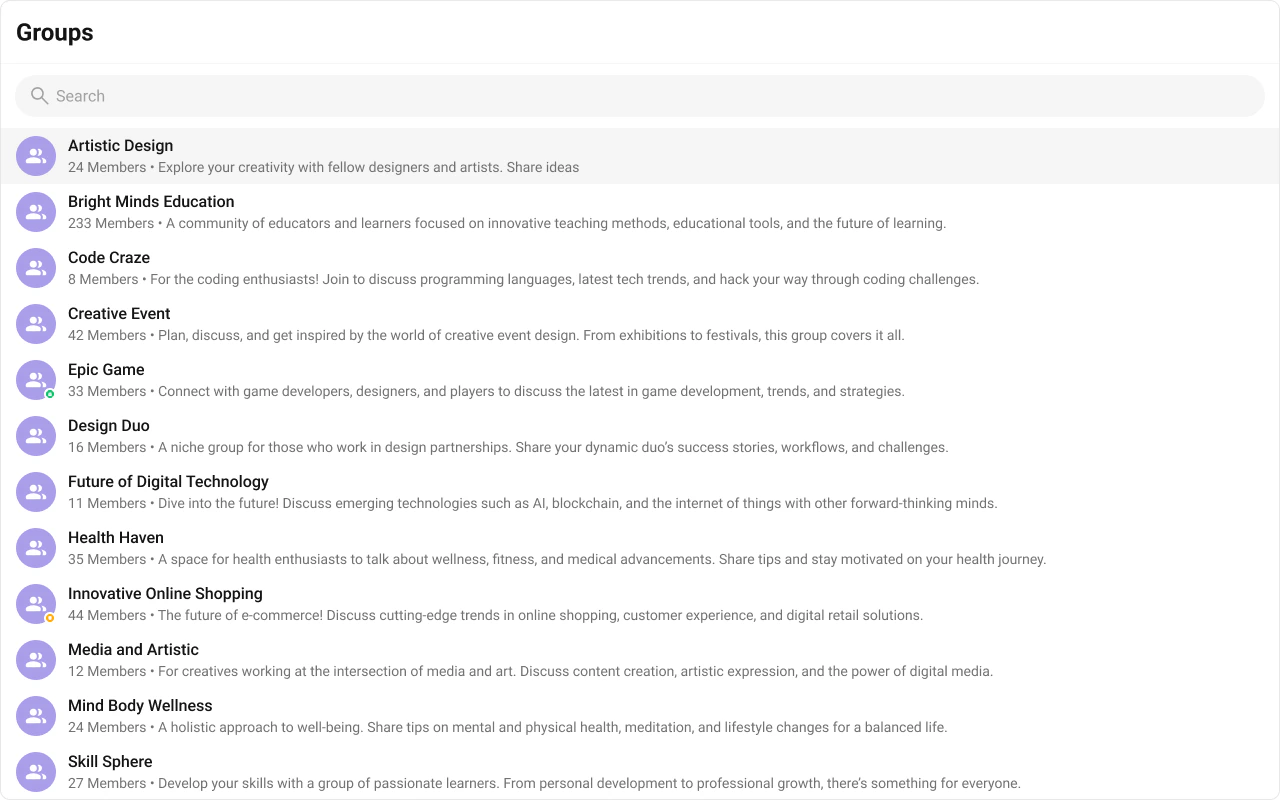 The Groups is a Component, showcasing an accessible list of all available groups. It provides an integral search functionality, allowing you to locate any specific groups swiftly and easily. For each group listed, the group name is displayed by default, in conjunction with the group icon when available. Additionally, it provides a useful feature by displaying the number of members in each group as a subtitle, offering valuable context about group size and activity level.